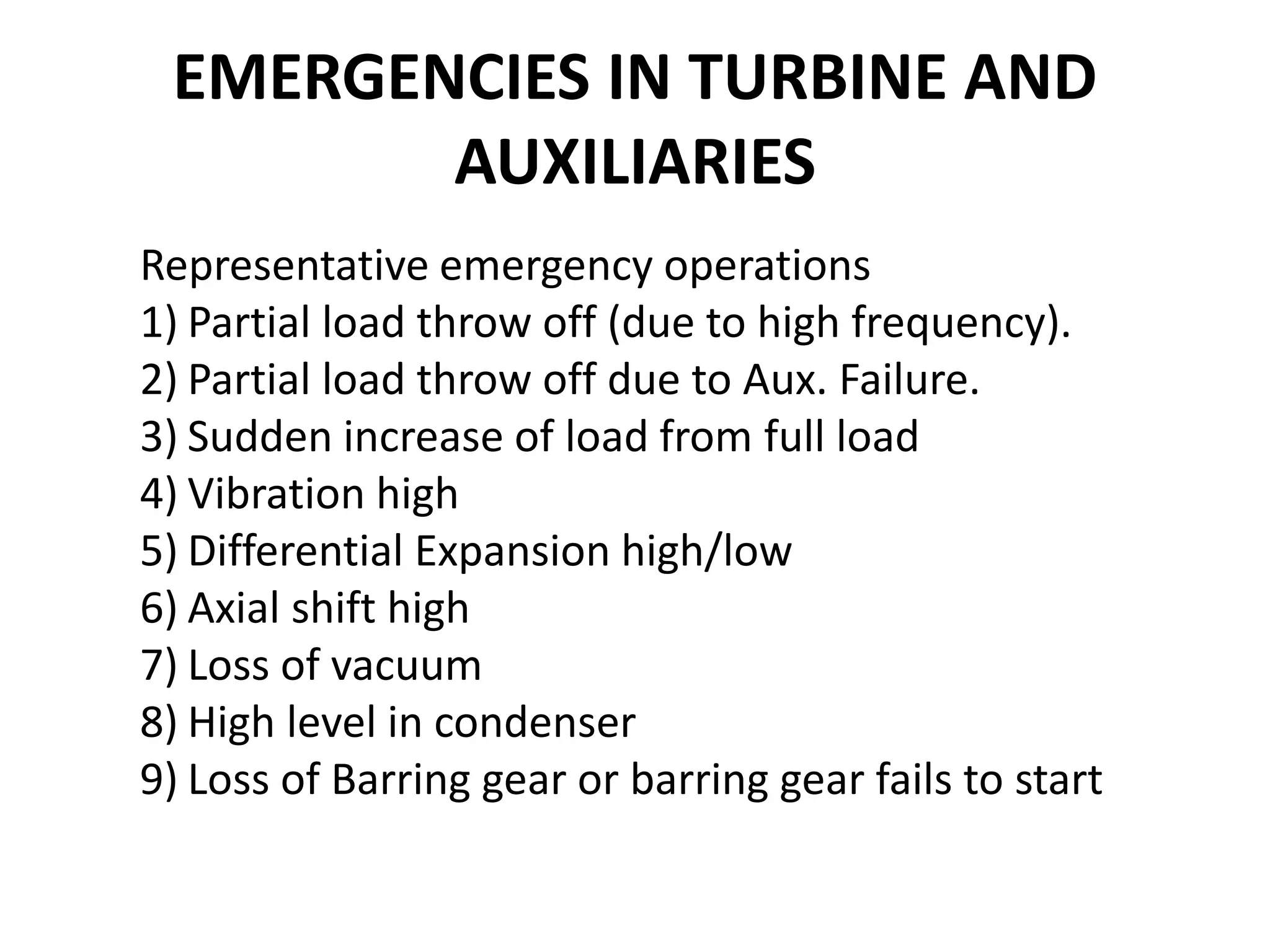 The document outlines emergency procedures for handling turbine situations, including various causes for partial load throw offs and high vibrations along with the necessary corrective actions. Key actions involve maintaining proper load control, monitoring pressure levels, and managing oil temperature to ensure safe operations. It emphasizes the need for constant observation of machinery conditions to prevent damage and ensure smooth functioning during emergencies.