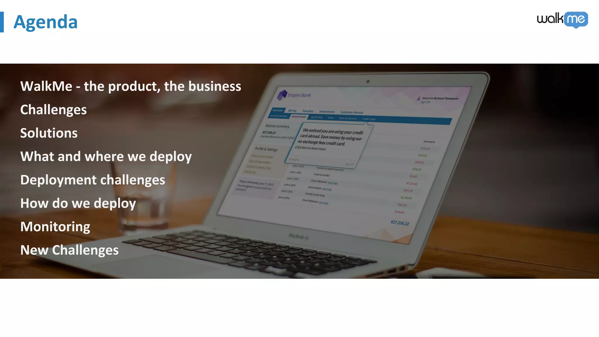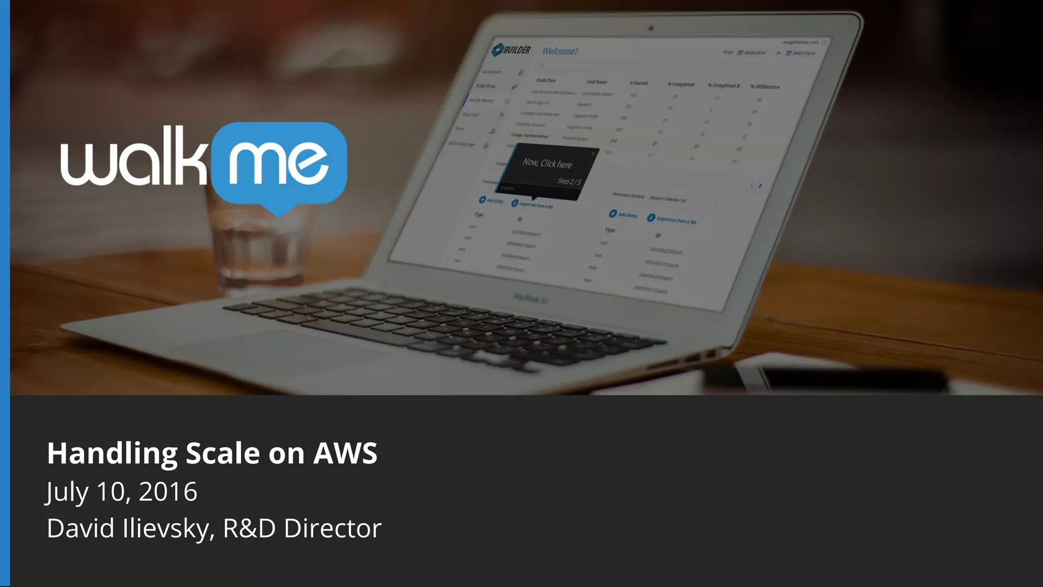 This document discusses WalkMe's use of AWS to handle scaling. It faces challenges of supporting high customer traffic, compatibility with existing customer frameworks, and security. Solutions include using CloudFront for static files, Elastic Beanstalk, automation, and VPC. WalkMe deploys client-side code to S3 and server applications to EC2 or Elastic Beanstalk. Deployment challenges include downtime, caching, security, and quality. Monitoring is crucial without scaling, including the deployment process, applications, servers, and end user experience.