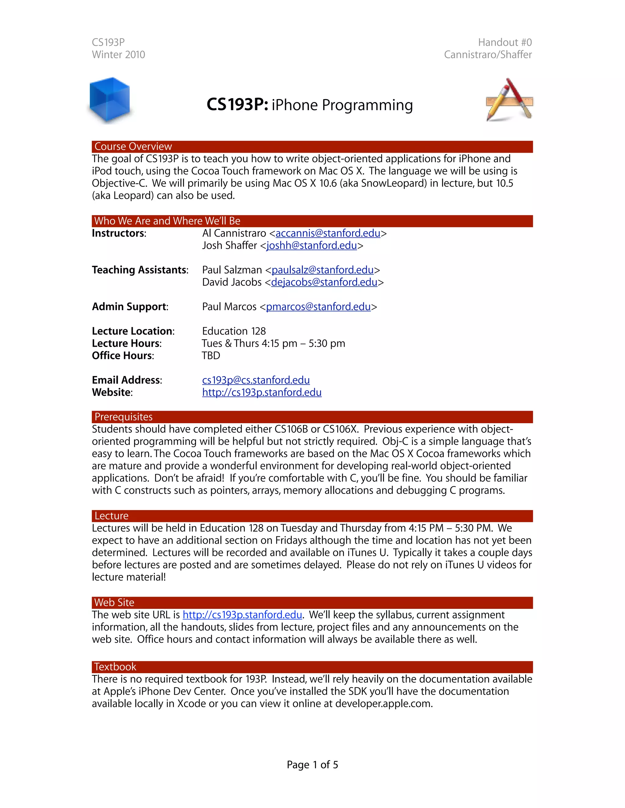 This document provides an overview and introduction to the CS193P iPhone programming course at Stanford. It outlines the course goals, which are to teach object-oriented application development for iPhone and iPod Touch using Objective-C and Cocoa Touch. It introduces the instructors and TAs, provides information about lectures, assignments, prerequisites, and grading. It also discusses the course website, textbook, honor code, and frequently asked questions.