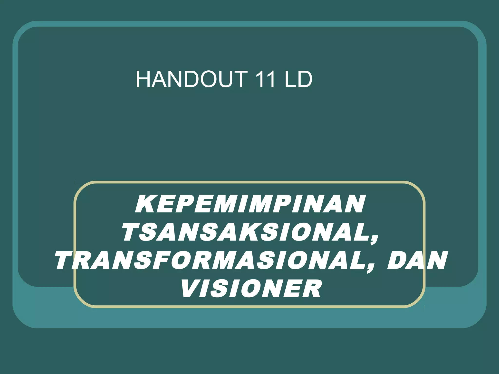 Dokumen tersebut membahas tiga jenis kepemimpinan yaitu transaksional, transformasional, dan visioner. Kepemimpinan transaksional lebih fokus pada tugas, sedangkan transformasional berfokus pada motivasi dan visi bawahan. Kepemimpinan visioner memiliki pandangan jauh ke depan dan berupaya mengembangkan organisasi."