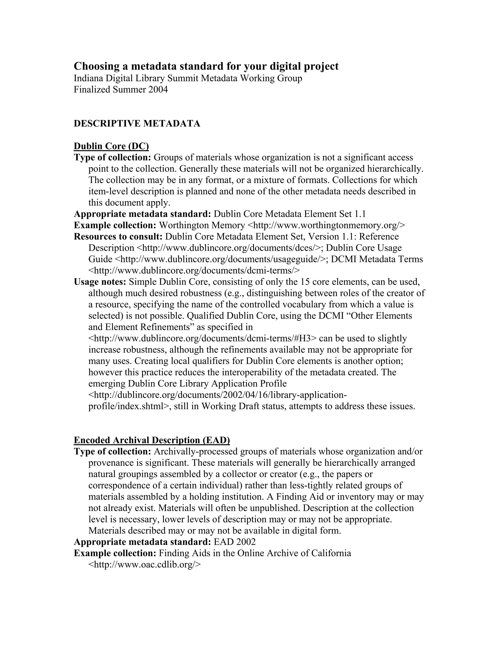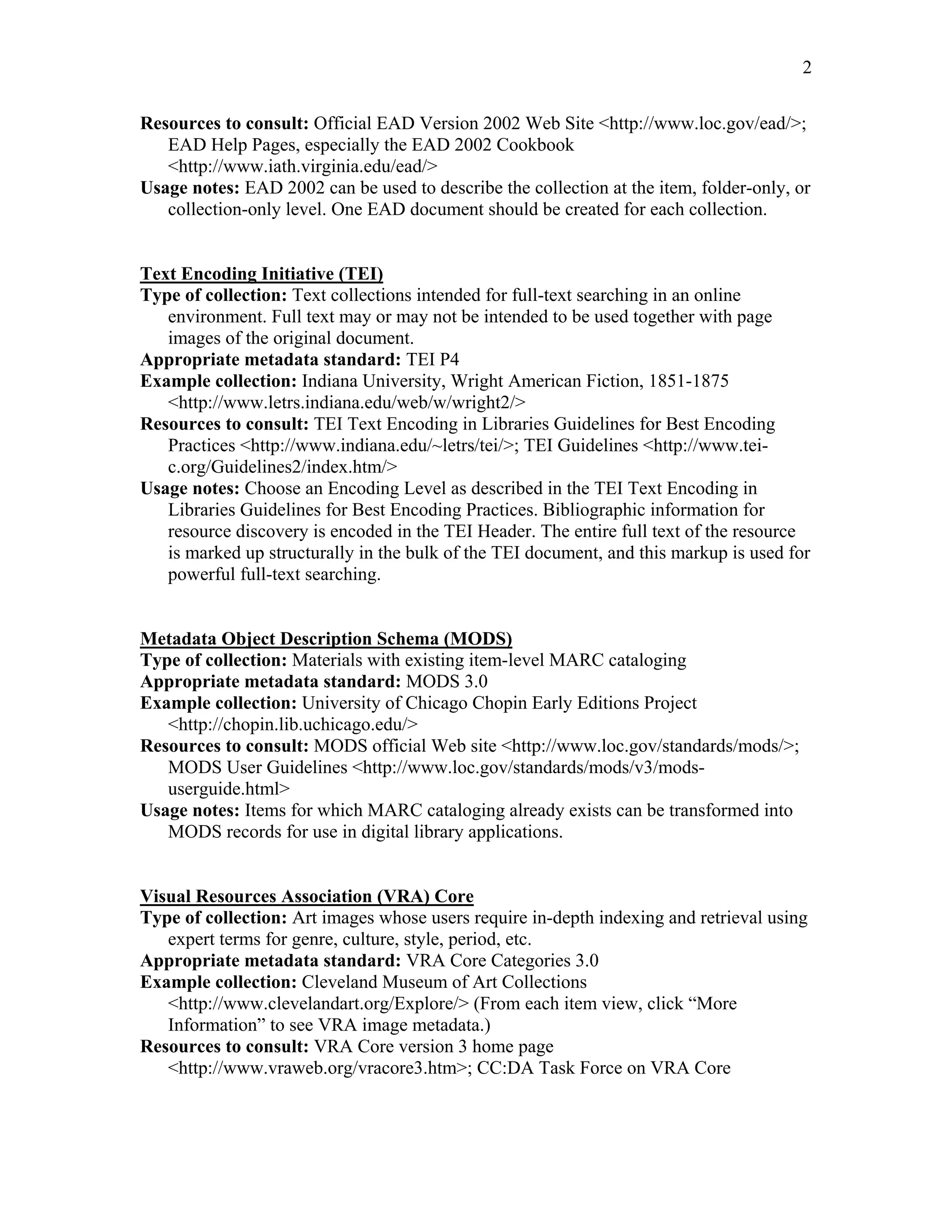 The document discusses various metadata standards suitable for digital collections, including Dublin Core, EAD, TEI, MODS, VRA Core, and GEM, outlining their appropriate use cases. It emphasizes the importance of selecting the right standard based on the type of collection and provides examples along with resources for further guidance. Additionally, it includes notes on the implications of creating local qualifiers and the importance of interoperability in metadata.
