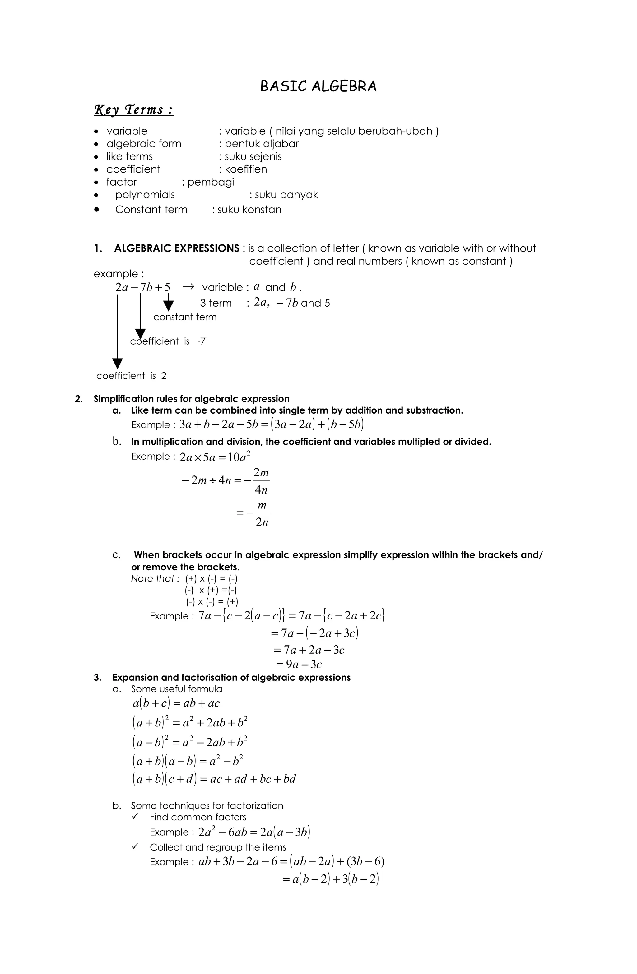 1. Basic algebra involves variables, algebraic expressions, and equations. Variables represent unknown values.