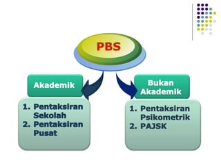 Dokumen tersebut membahasikan pentingnya pentaksiran dalam pendidikan untuk mengetahui tingkat pemahaman dan kemampuan murid, serta menyediakan umpan balik untuk meningkatkan pembelajaran. Dokumen ini juga menjelaskan berbagai jenis pentaksiran seperti pentaksiran sekolah, pusat, psikometrik, dan aktivitas non-akademik serta cara melaporkan hasilnya.
