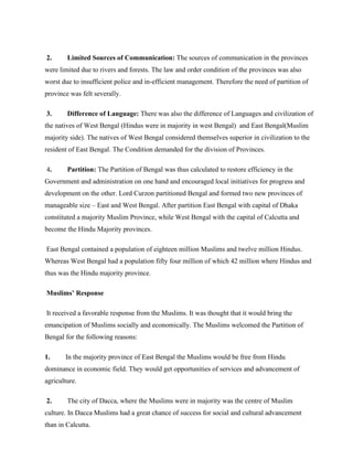 2) It then discusses the 1905 partition of Bengal by the British for administrative reasons, which received a favorable response from Muslims but was opposed by Hindus.