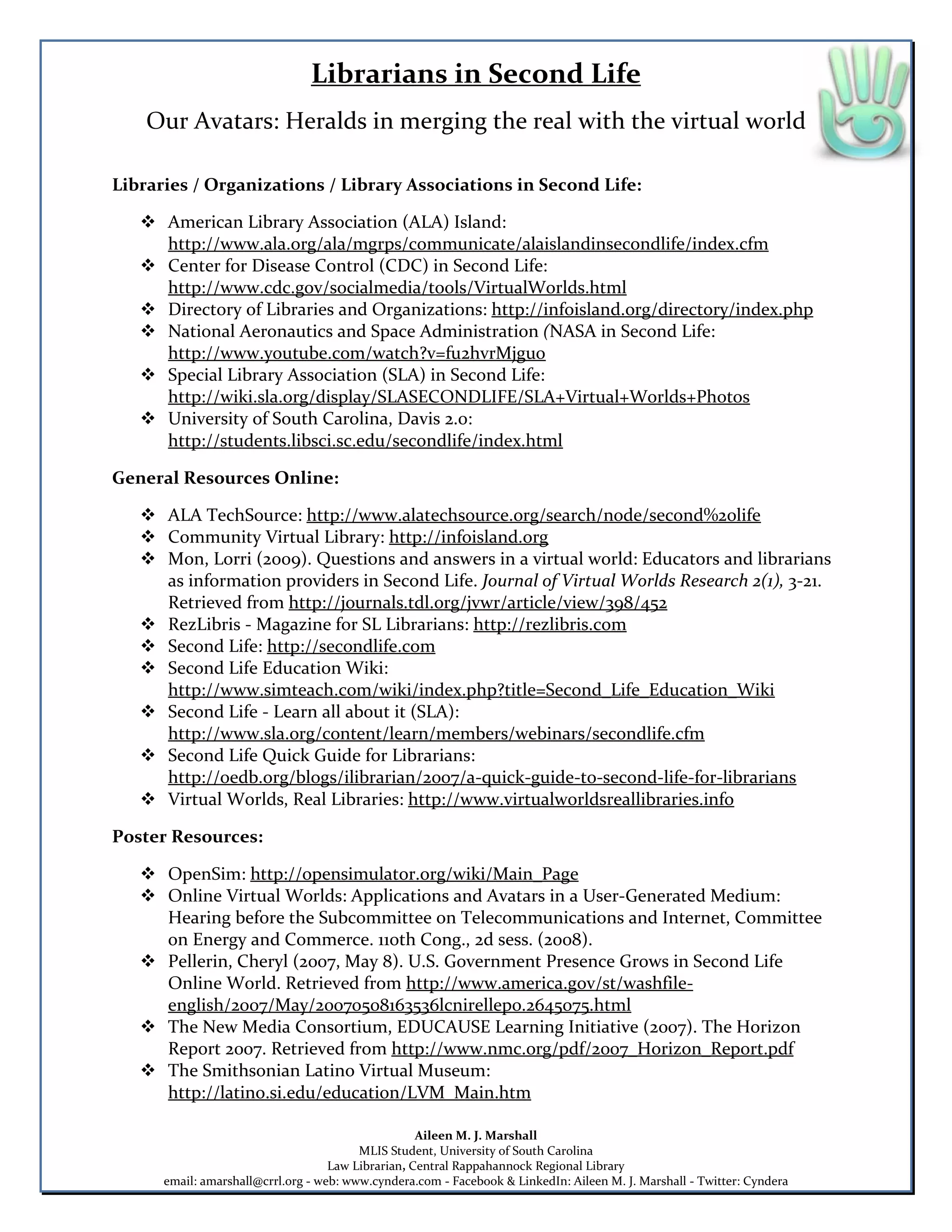 This document discusses how libraries and organizations are using virtual worlds like Second Life. It provides examples of several libraries and organizations that have a presence in Second Life, including the American Library Association, Center for Disease Control, and NASA. It also lists general resources for librarians about using Second Life and virtual worlds, such as websites, magazines, and guides. Finally, it mentions some additional resources on related topics like OpenSim and virtual world hearings.