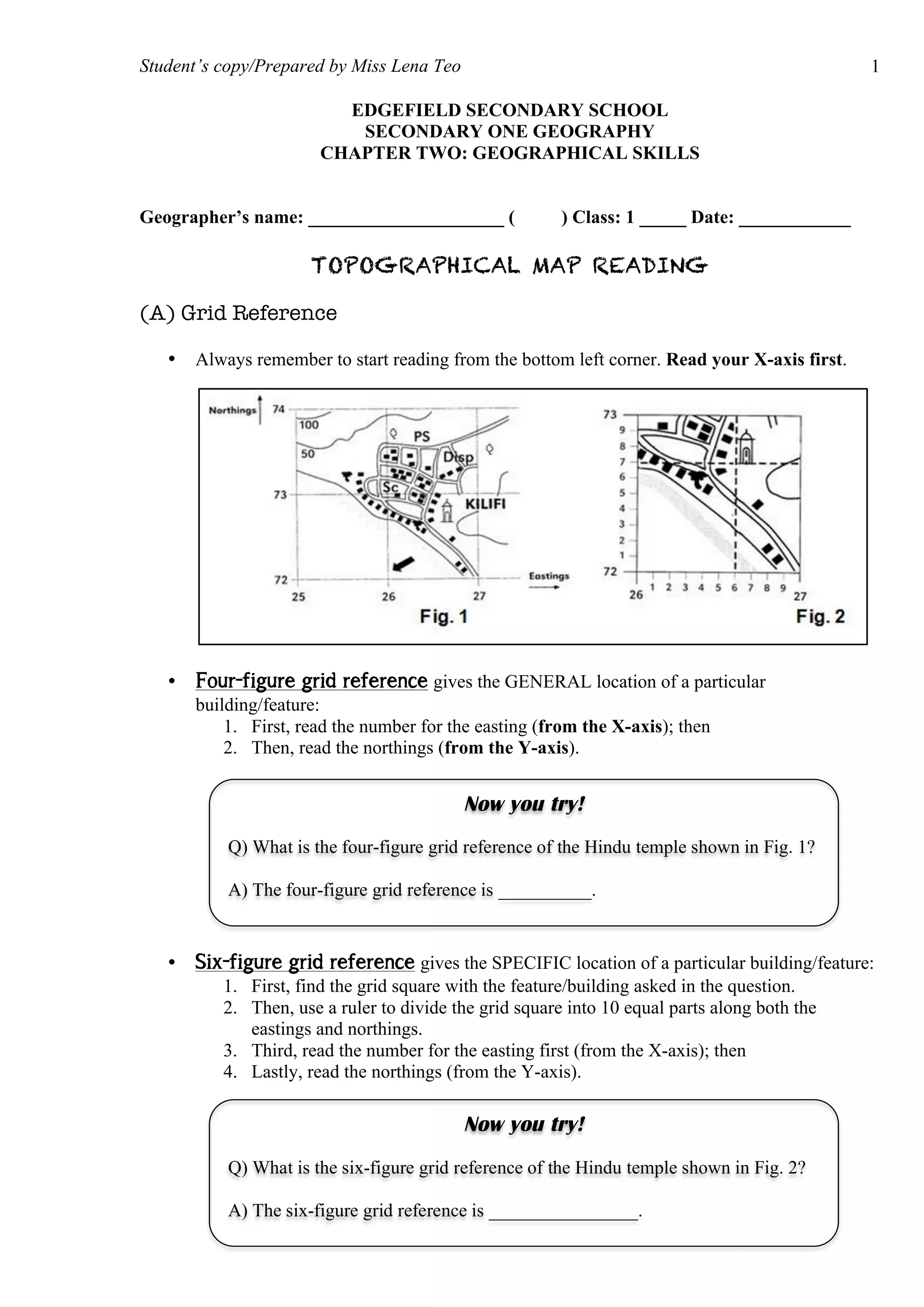 1) The document discusses different geographical skills used for reading topographical maps, including grid references, compass directions, straight line distances, and contour lines.