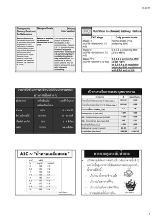 and Its Relevance Ranges/Goals Dietary Intervention Reduce Albuminuria Decreased albuminuria is associated with slower progression of CKD, particularly in diabetics. Limiting dietary protein may re-duce albuminuria and improve blood glucose control, hyper- lipidemia, blood pressure, renal bone disease, and metabolic acidosis. (de Zeeuw et al, 2004). Reduce or stabilize the amount of albumin lost in the urine Limit excessive dietary protein as follows: • Nondiabetic: 0.8 g protein/kg/day.• Diabetic: 0.8-1.0 g protein/kg/day. Evidence suggests that further lowering to 0.6 g protein/kg/day in nondiabetic patients may be beneficial, but adherence is difficult. Some patients may be able to achieve this level with intensive counseling. ชนิดา ปโชติการ Nutrition in chronic kidney failure AJKD 2000 CKD stage Daily protein intake Stage I-II (eGFR >60ml/min/1.73 m2) Normal intake (<1g protein/kg IBW) Stage III (eGFR >30-59/min/1.73 m2) 0.6-0.8 g protein/kg IBW (2/3 of HBV) Stage IV-V (eGFR <30/min/1.73 m2) 0.6-0.8 g protein/kg IBW (2/3of HBV) or 0.3-0.4 g of vegetable origin/kg IBW supplement with EAA and /or KA ชนิดา ปโชติการ เวลาทีใช้ในการเปลียนไปเป็นนําตาลของ อาหารชนิดต่างๆ ชนิดอาหาร %ที่เปลี่ยนไป เวลาที่ใช้ในการ เปลี่ยนเป็นนํ้าตาล นํ้าตาล 100% 15 – 30นาที ข้าว แป้ง ผลไม้ 90-100% 30 - 90 นาที เนื้อสัตว์ นม ไข่ 58% 3 - 4 ชั่วโมง ไขมัน 10-30% หลายชั่วโมง ชนิดา ปโชติการ เป้ าหมายในการควบคุมเบาหวาน การตรวจ ดี ต้องปรับปรุง นํ้าตาลในเลือดขณะอดอาหาร(มก./ดล.) 80-120 >140 นํ้าตาลในเลือดหลังอาหาร 2 ชม(มก./ดล.) 80-160 >180 นํ้าตาลเฉลี่ยสะสมHbA1c (%) <7 >8 โคเลสเตอรอลรวม (มก./ดล.) <200 >250 LDL- โคเลสเตอรอล(มก./ดล.)-ตัวไม่ดี <100 >130 HDL- โคเลสเตอรอล (มก./ดล.)-ตัวดี >45 <35 ไตรกลีเซอไรด์(มก./ดล.) <200 >400 ดัชนีมวลกาย (กก./ตารางเมตร) 20-25 >27 ความดันเลือด (มม.ปรอท) 130/85 >160/90 ชนิดา ปโชติการ A1C ~ “นํ้าตาลเฉลี่ยสะสม” American Diabetes Association A1C eAG % mg/dL mmol/L 6 126 7.0 6.5 140 7.8 7 154 8.6 7.5 169 9.4 8 183 10.1 8.5 197 10.9 9 212 11.8 9.5 226 12.6 10 240 13.4 Formula: 28.7 x A1C - 46.7 - eAG ชนิดา ปโชติการ การควบคุมระดับนํ้าตาล • เป้าหมายที่ต้องการคือกินให้ระดับนํ้าตาลขึ้นช้าๆ และไม่ขึ้นสูง อาหารที่ส่งผลต่อการควบคุมระดับ นํ้าตาลมีดังนี้ – ปริมาณ นํ้าตาล ข้าว แป้ง – ปริมาณใยอาหารที่กิน – ปริมาณไขมันจากสัตว์ที่กิน – ความบ่อยครั้งในการกิน