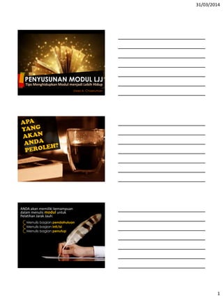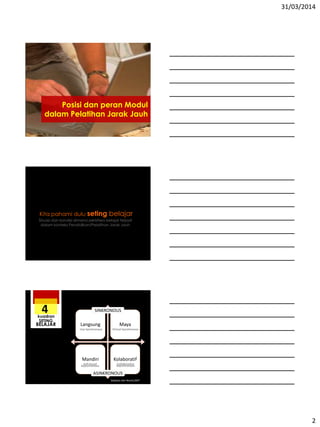 Dokumen ini membahas cara penyusunan modul untuk pelatihan jarak jauh, mencakup bagian pendahuluan, inti, dan penutup. Modul harus dirancang agar dapat dipelajari secara mandiri dengan karakteristik yang memudahkan peserta didik, seperti kebebasan waktu dan tempat belajar. Penekanan juga diberikan pada penggunaan bahasa yang komunikatif serta penggunaan media dan visual yang menarik untuk meningkatkan pemahaman.