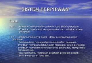 Dokumen ini membahas sistem perpipaan pada kapal, mencakup perencanaan, instalasi, dan perawatan sistem pipa termasuk jenis katup, tangki, dan peralatan yang dibutuhkan. Aspek teknis, ekonomis, dan operasional juga diuraikan dalam konteks penerapan di lapangan, menekankan pentingnya peraturan klasifikasi dan tahapan desain. Selain itu, dokumen ini menjelaskan material pipa yang digunakan dan kriteria pemilihan berdasarkan tekanan dan temperatur kerja.