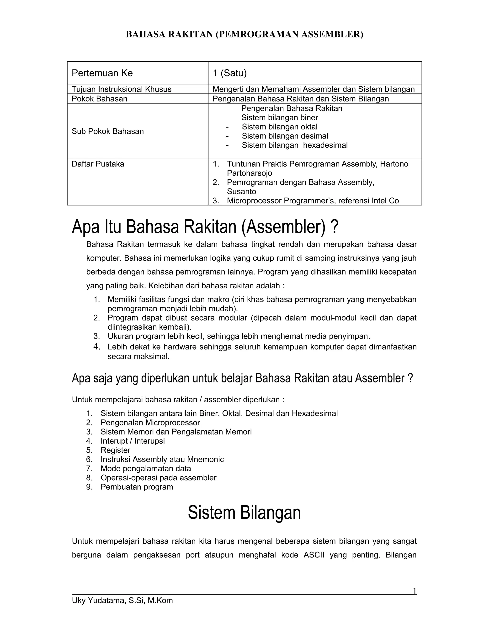 Dokumen ini memberikan pengantar tentang bahasa rakitan (assembler), sistem bilangan, dan konsep memori dalam konteks pemrograman komputer. Dengan menjelaskan karakteristik bahasa rakitan, variasi sistem bilangan (biner, oktal, desimal, heksadesimal), serta struktur dan pengalamatan memori PC, dokumen ini merupakan panduan penting bagi pemahaman dasar pemrograman sistem. Selain itu, dokumen juga mencakup aspek-aspek seperti interrupt dan jenis-jenis register dalam mikroprosesor.