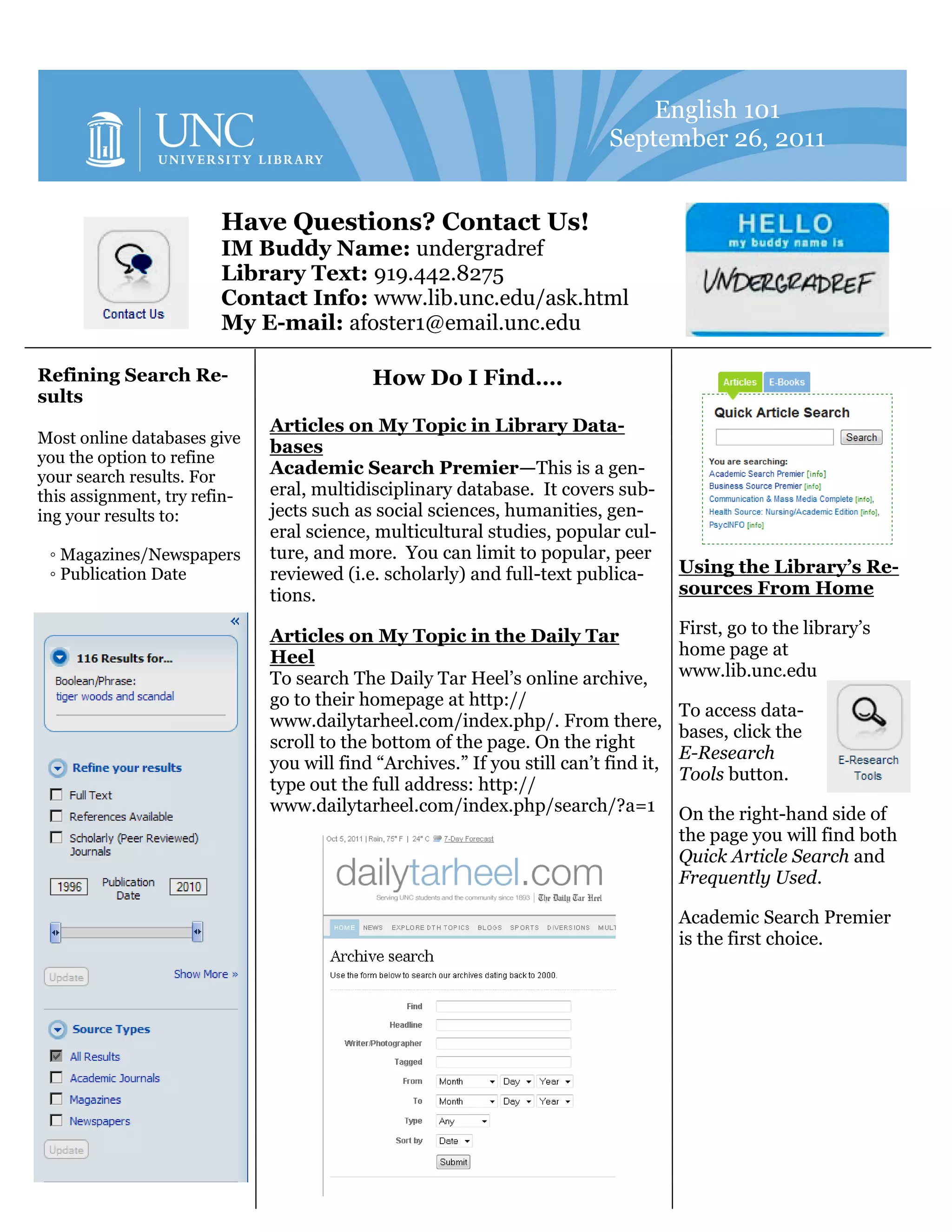 The document provides guidance on how to find articles on a topic in the library databases and the Daily Tar Heel archive, as well as how to access library resources from home. Contact information is given for the undergraduate reference desk, which can help with citing sources using citation guides and handbooks. Students are directed to databases like Academic Search Premier and search tools on the library website to find relevant articles.