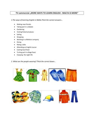 The document lists various ways that one can learn English while visiting Malta, including making friends, taking part in debates, visiting historical places, sailing, attending English courses, tasting local food, and taking part in village feasts. It also asks the reader to identify what types of clothing people are wearing in an accompanying image.