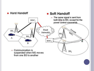The document discusses different types of handovers in cellular networks. A handover occurs when a mobile device moves between different base stations. There are two main types - hard handovers where the existing radio link is dropped briefly as the call is transferred to a new base station, and soft handovers where the call can be transferred without being briefly disconnected by maintaining connections to multiple base stations simultaneously. Handovers are important for mobility in cellular networks to maintain call quality as users move between different coverage areas without dropping calls.