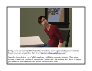This document introduces Hands Off, a Sim who is beginning an Apocalypse/Legacy challenge with several handicaps including being unable to directly control the Sim. The summary provides an overview of Hands Off and his first day which involves claiming his dorm room, studying skills, and watching movies. Hands Off spends most of his time studying skills in an attempt to max all 7 skills. The document follows Hands Off over time as he works to fulfill his aspiration and max his skills with limited direct control.