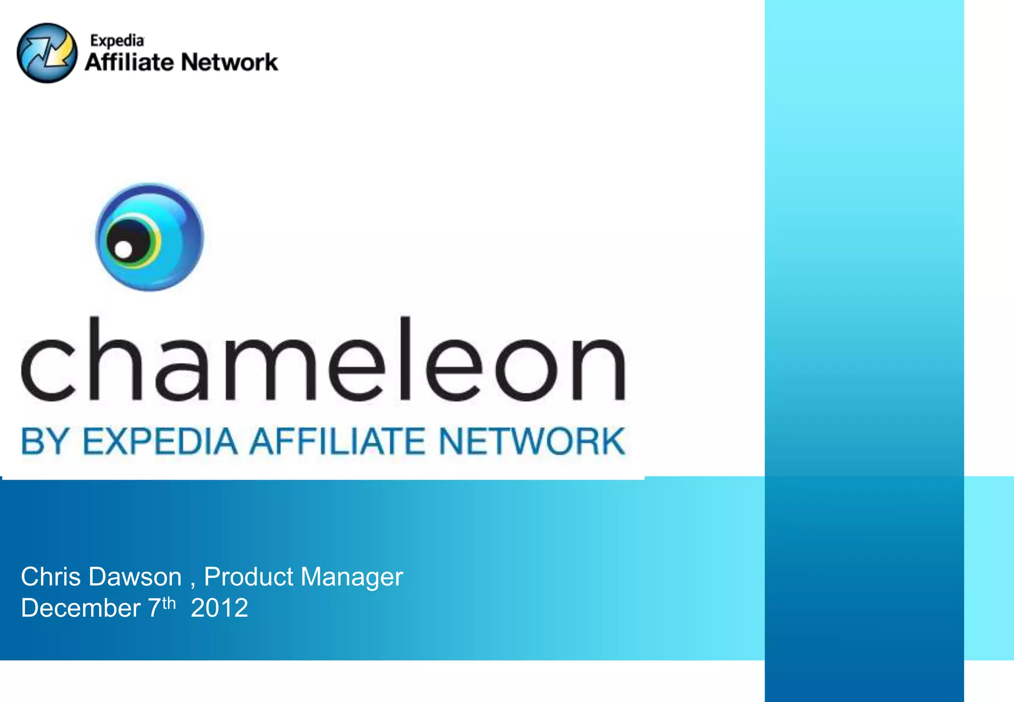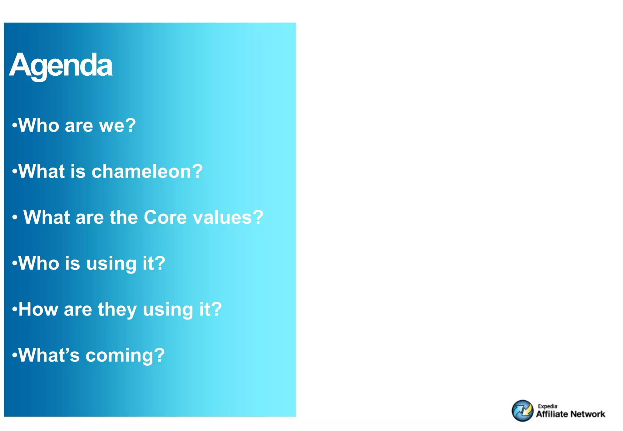 This document provides an overview and agenda for a briefing about Chameleon, a product merchandising and monetization tool. It introduces Chameleon, discusses its core values of agility, high conversion, and speed. It outlines who is using Chameleon and how, including for landing pages, deep links from websites or APIs, and merchandising pages. It closes with the roadmap, including improvements to user authentication, new package rates and mobile offerings, enhanced merchandising and reporting capabilities.