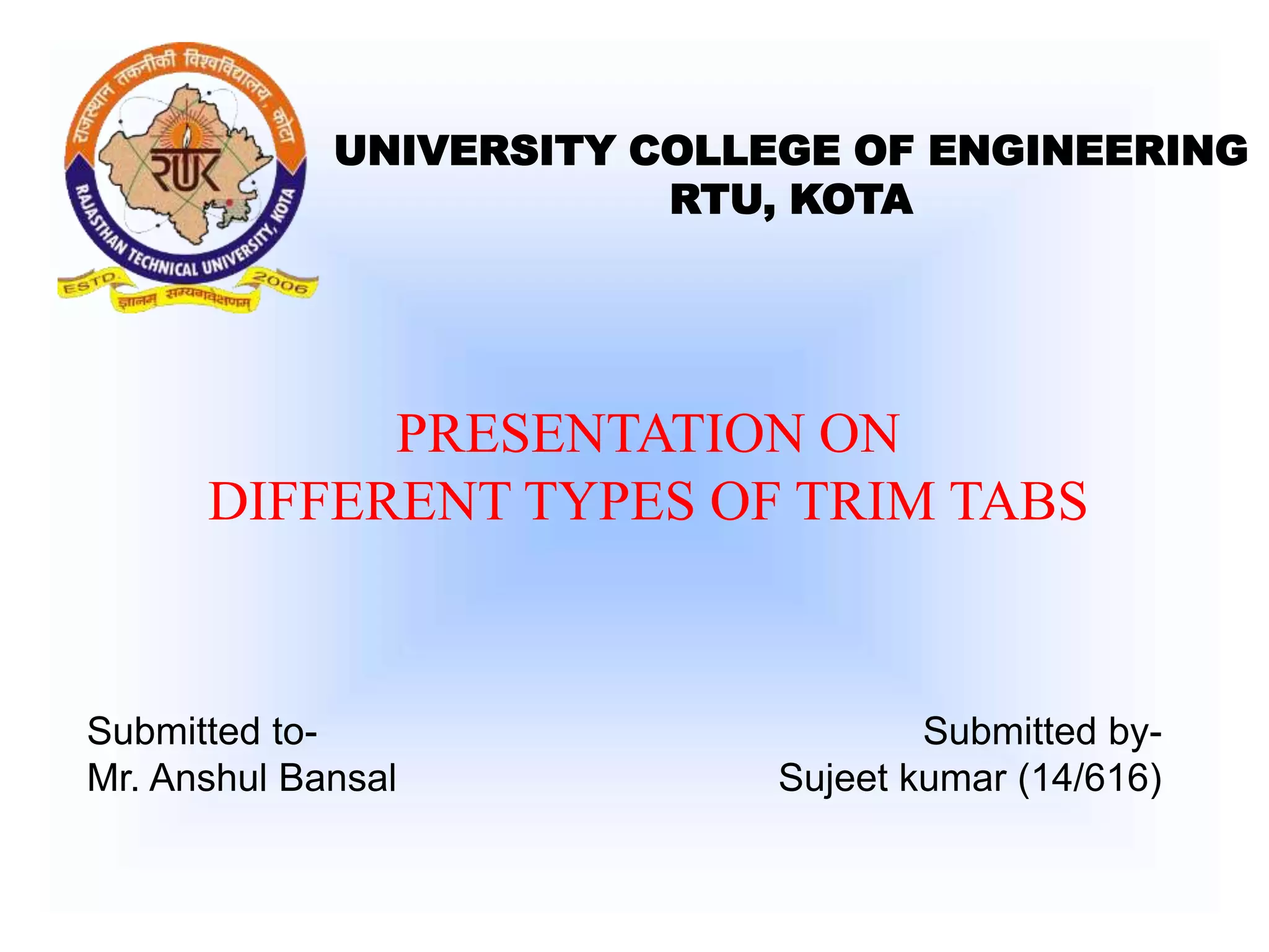 This document discusses different types of trim tabs used on aircraft. It describes the location of trim tabs on elevators, rudders, and ailerons. Elevator trim tabs help balance control forces and maintain the desired angle of attack, especially during slow flight. Elevator trim tab position determines whether the elevator is pushed up or down. Rudder and aileron trim tabs counter the effects of slipstream or an off-center center of gravity from uneven fuel levels or passenger weight. Types of trim tab systems include elevator trim tab systems and rudder trim tab systems.