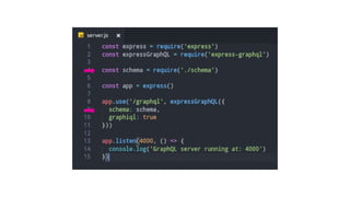 GraphQL is a query language for APIs that allows clients to request specific data fields from resources in a single request. It provides database independence, acts as an API middleware, and allows APIs to evolve without versioning by defining types and fields. This document demonstrates how to build a basic GraphQL API using Node.js, Express, and GraphQL tools like GraphiQL by defining a schema, root query, and relationships between types.