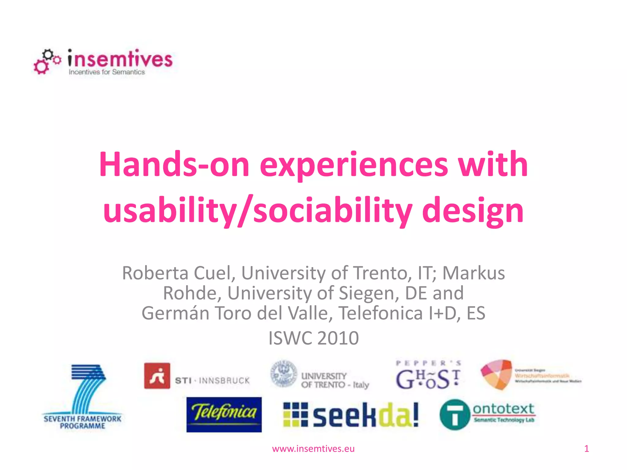 This document presents methods for evaluating the usability and sociability of systems, including usability testing, eye tracking, and standardized evaluation. It summarizes a case study applying these methods to evaluate an existing SEEKDA system and develop a revised prototype. Usability testing identified critical issues and design recommendations. A prototype was created and evaluated through an online participatory design workshop with users. The document concludes by describing how explorations and user walkthroughs can be used.