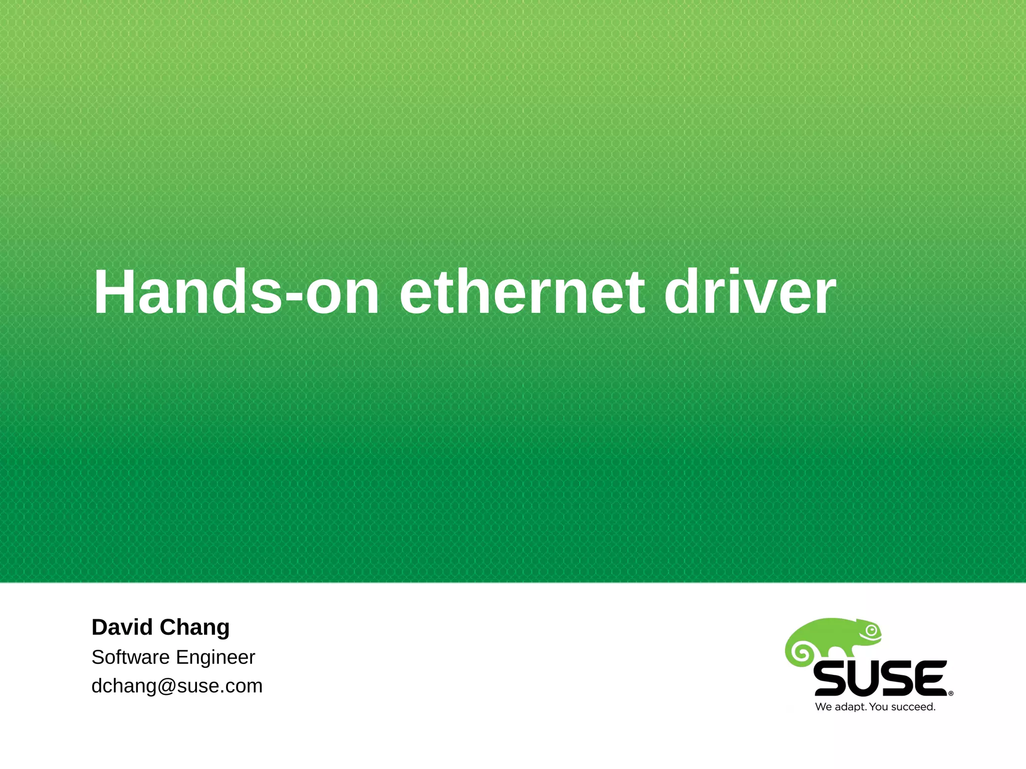 This document provides an overview of the data structures and functions used to implement ethernet drivers in the Linux kernel. It discusses the net_device and sk_buff structures that represent network interfaces and packets. It also describes how the driver interacts with the kernel via polling, interrupts, and NAPI to handle reception and transmission of frames. Finally, it provides an example of the key components needed for a simple ethernet driver, including initialization, setup, open/close, transmission, and reception functions.