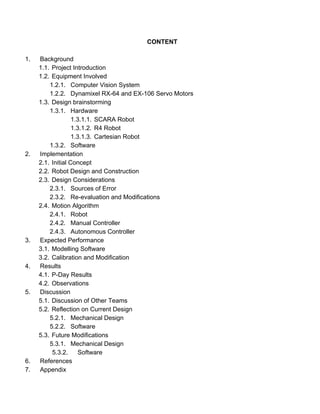 This document provides a final report on a project to build a robotic arm capable of drawing on paper. It describes the background and objectives of the project, the team's design process in which they considered several robot arm designs before selecting a Cartesian robot, and details of how they implemented that design. It discusses sources of error they encountered and modifications made to address them. Sections also cover the robot's motion algorithm, expected performance, results from testing, and ideas for future improvements.