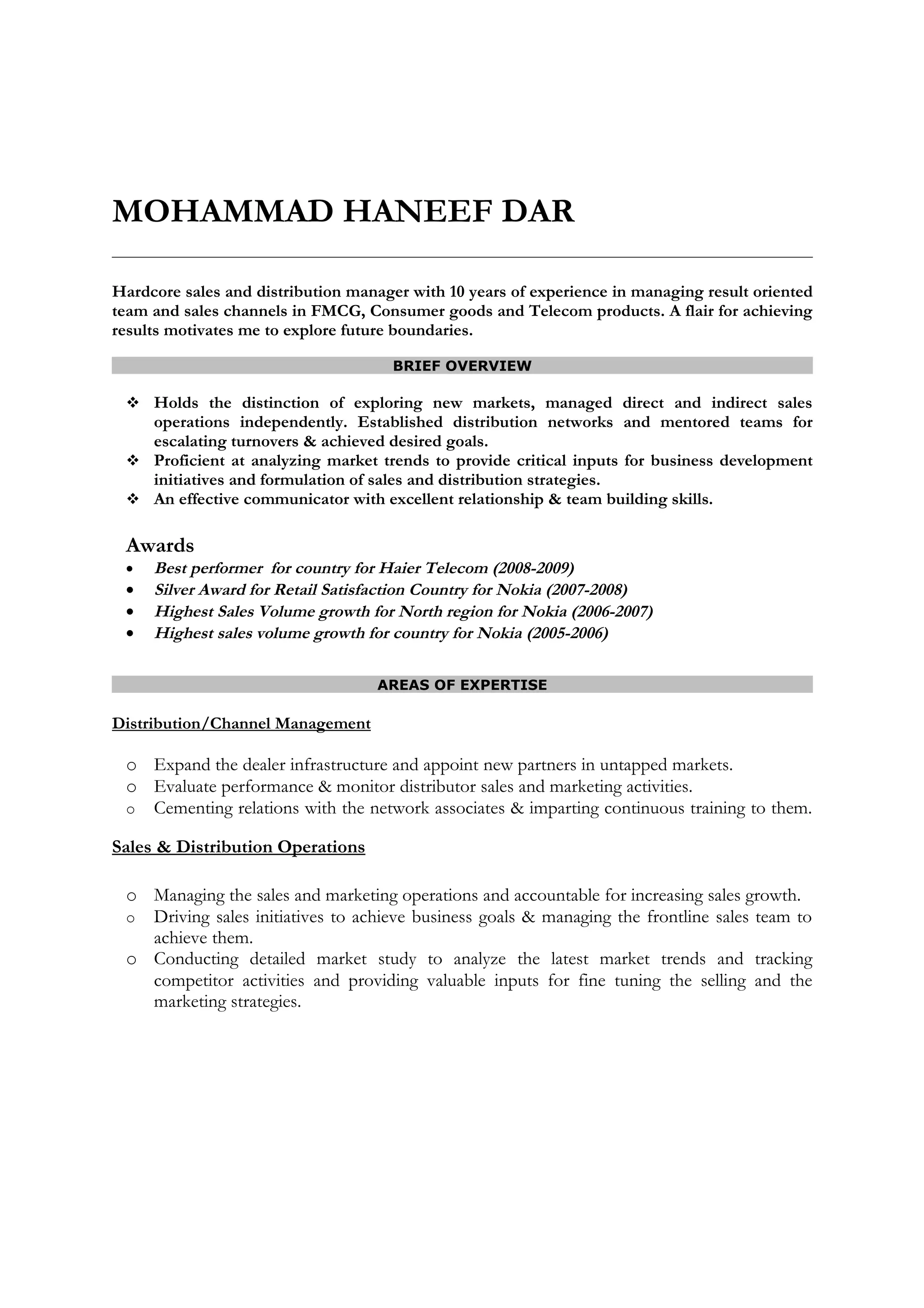 Mohammad Haneef Dar has over 10 years of experience in sales and distribution management in FMCG, consumer goods, and telecom. He has a track record of achieving sales goals and expanding distribution networks. Currently he is an Area Sales Manager for Idea Cellular based in Jammu where he helped launch their services and achieved activation and revenue targets. He has received several awards for sales performance from prior roles at Haier Telecom, Nokia, and ITC Limited.