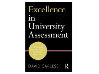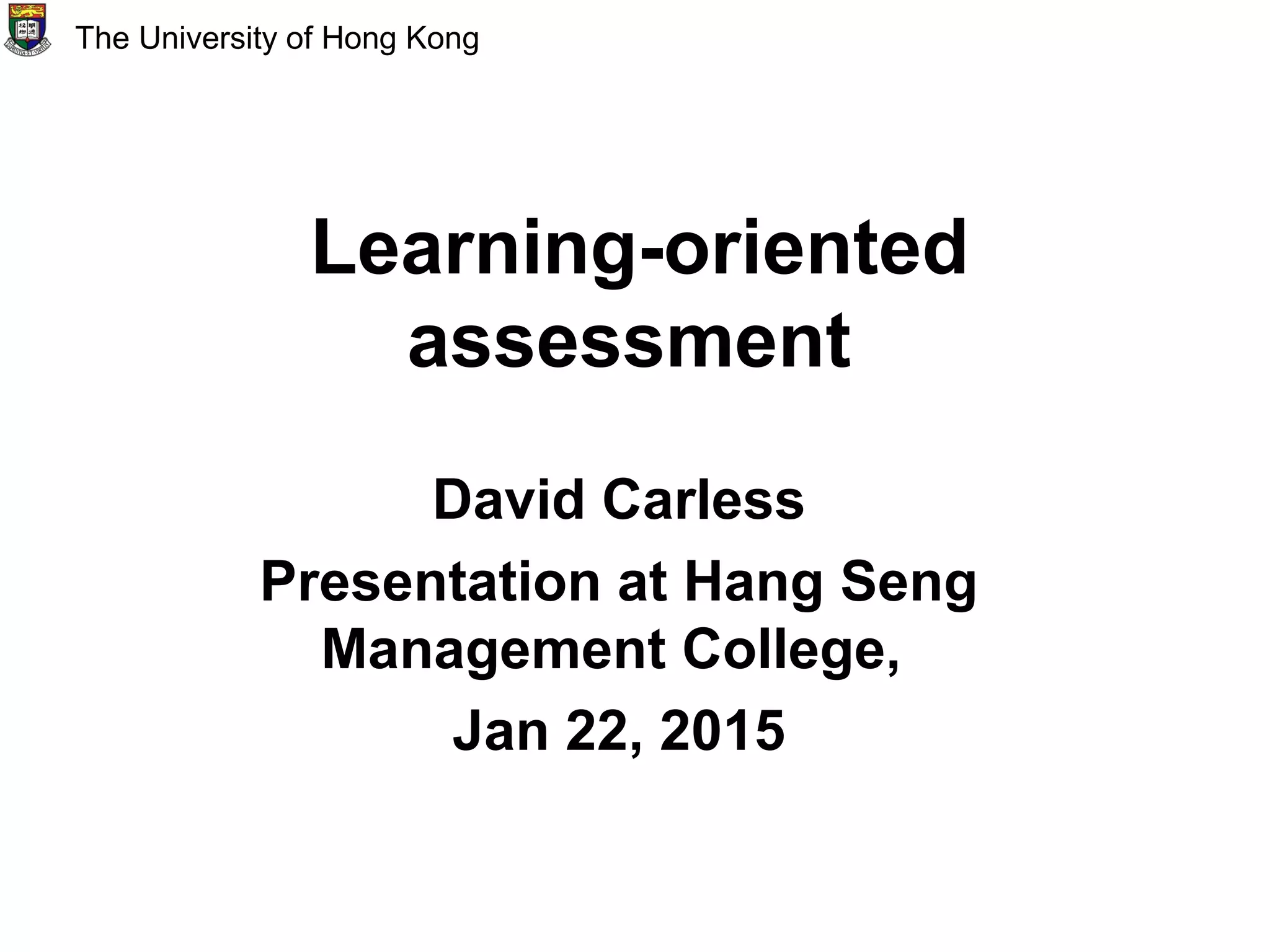 David Carless presented on learning-oriented assessment. He discussed three key components of learning-oriented assessment: productive assessment task design, student self-evaluative capacities, and student engagement with feedback. For task design, assessments should be integrated with instruction, spread student effort, mirror real-life uses of disciplines, and incorporate feedback dialogues. Developing student self-evaluation involves teaching rubrics, exemplars, and peer collaboration. Promoting feedback engagement connects feedback to student needs, ensures timeliness, and develops effective self-evaluation. The implications discussed integrating assessments, using program-based approaches, involving students in rubrics and exemplars, and encouraging various feedback dialogues.