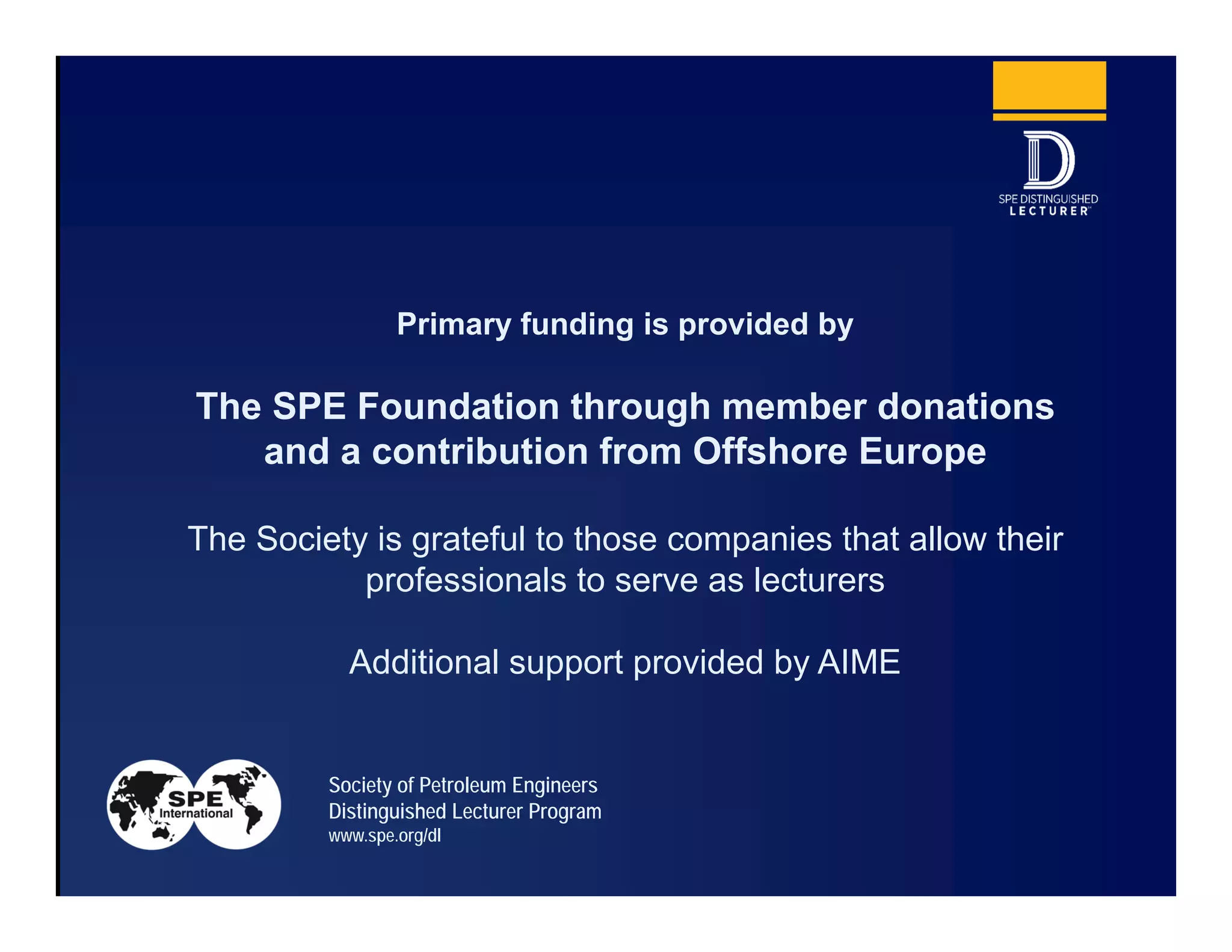 The Distinguished Lecturer Program provides concise summaries of technical documents on facilities sand management. This summary covers a two-day course on the topic presented by Dr. Hank Rawlins, who has over 25 years of industry experience. The course covers the five key steps to managing sand in production facilities: separation, collection, cleaning, dewatering, and transport. It emphasizes understanding sand issues in facilities rather than focusing on specific equipment.