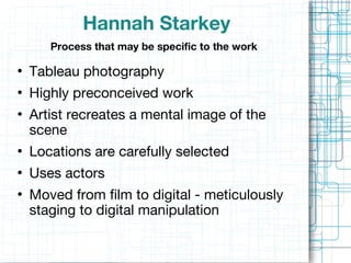 Hannah Starkey is a British photographer born in 1971 in Belfast, Northern Ireland. She studied photography in Edinburgh and London and has been actively exhibiting her work since 1997. Starkey stages highly meticulous and preconceived photographic tableaux that depict ambiguous everyday moments. Her photos demand interpretation but resist easy explanation. She draws inspiration from photographers like Diane Arbus, Helen Levitt, Jeff Wall, and Andreas Gursky.