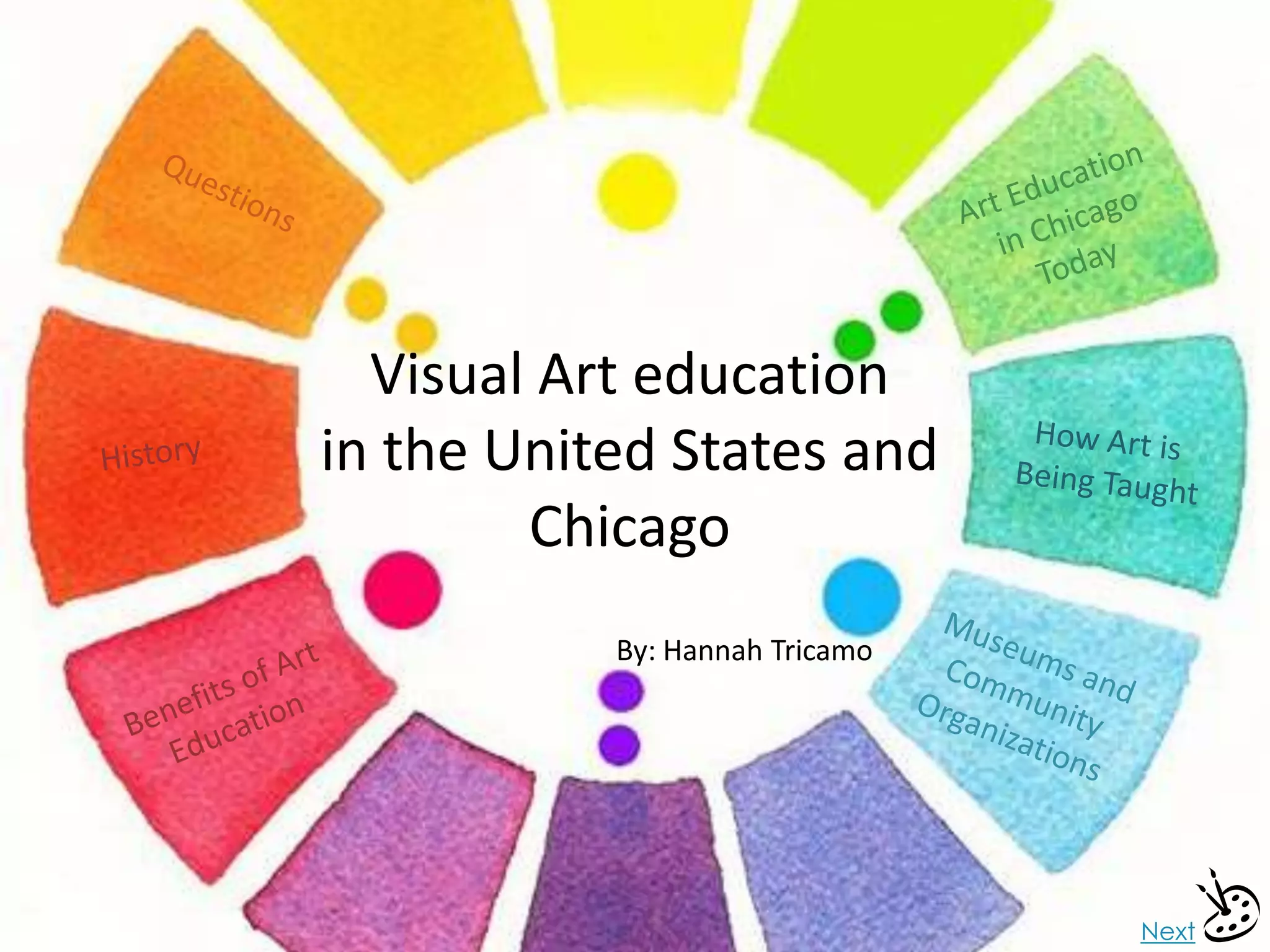 The document provides an overview of art education in the United States and Chicago. It discusses the history of art education in the US from the late 19th century to present, including key events and reforms. It also examines the state of art education in Chicago, benefits of art education, and how art is taught in schools through approaches like Discipline Based Art Education and Teaching for Artistic Behaviors. The document utilizes information gathered from research, observations of art classes, and interviews with art teachers.