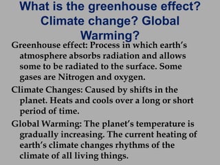 The document discusses global warming, the greenhouse effect, and climate change. It defines these terms and explains how they are interrelated. Global warming refers to the gradual increase in Earth's temperature caused by human activity that increases greenhouse gases. This leads to changes in climate over both short and long periods. The greenhouse effect describes how the atmosphere absorbs and radiates heat from the sun, which can impact temperatures. The document then discusses the primary human causes of global warming, potential economic and environmental consequences, and some actions individuals can take to reduce their contribution to the problem. It also presents opposing arguments that question the extent or causes of global warming.