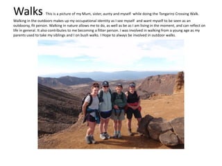 Hannah identifies several occupations that reflect her identity, including walking, surfing, camping, rock sliding, yoga, socializing, being a student, and her goal of becoming an occupational therapist. She sees herself as outdoorsy, fit, adventurous, relaxed, able to interact socially, and interested in helping others. These occupations allow her to engage fully in the present moment and feel a sense of belonging. She hopes to develop strengths like calmness, focus, flexibility and health through her occupations.