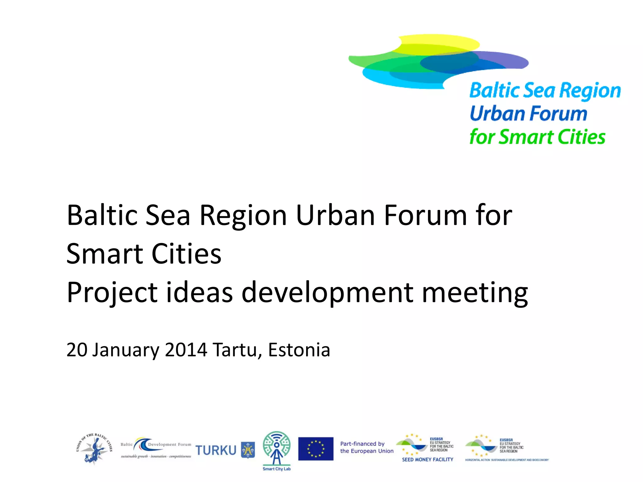 This document outlines a meeting to develop a concept for the Baltic Sea Region Urban Forum for Smart Cities. The challenges facing Baltic Sea cities regarding green transitions, innovation/business cooperation, and citizen engagement will provide the background. Participants will discuss developing the concept for the Forum over the next few months, deciding if it should be a large annual meeting, ongoing activities, virtual marketplace, or something else, and identifying potential focus areas like environment, innovation, transportation or energy use. Milestones are outlined for concept development meetings in Tartu, Copenhagen, Riga, Örebro and Turku to finalize the concept by June 2014.