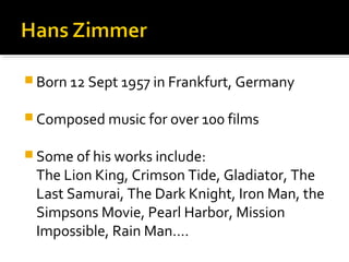 Miroslav Kaseric RM6/11 is a German composer born in 1957 who has composed music for over 100 films. Some of his most notable works include scores for The Lion King, Gladiator, The Dark Knight trilogy, and Iron Man. He is known for blending electronic music with orchestral arrangements and received several awards including Academy, Grammy, and Golden Globe awards for his work.