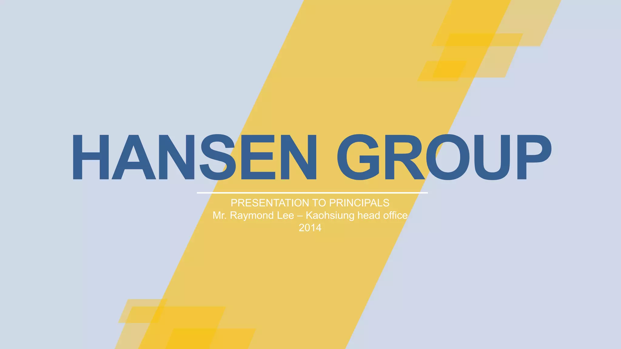 The document presents an overview of Hansen Group, a leading shipping agent in Taiwan established in 1988, which provides services including ship agency, husbandry, crew changes, and bunkering. It discusses the company's operations, team members with extensive experience, and overseas business entities. Performance analyses show Hansen Group handled over 1,000 port calls in 2013, primarily in Kaohsiung, Taichung, and Mailiao ports.