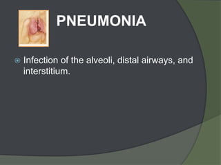 This document discusses hospital acquired pneumonia (HAP). It defines HAP as pneumonia occurring 48 hours or more after admission. It notes HAP is the second most common hospital infection and has high mortality and increased treatment costs. Risk factors include mechanical ventilation, underlying diseases, and factors compromising defenses. Common causes are gram-negative bacteria from oropharyngeal secretions. Diagnosis involves tests of sputum, blood and imaging. Empiric antibiotic treatment depends on risk of multidrug-resistant pathogens.