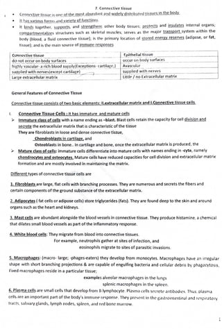 Connective tissue is one of the most abundant and widely distributed tissues in the body. It has various forms and functions including binding and supporting other tissues, protecting organs, compartmentalizing structures, serving as the transport system, storing energy reserves, and contributing to immune responses. Connective tissue consists of cells and an extracellular matrix. The matrix includes ground substance and fibers that provide structure, strength, and flexibility. There are many types of connective tissue including loose connective tissue, dense connective tissue, cartilage, bone, and liquid connective tissue.