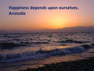 This document contains a collection of quotes about happiness from various notable figures such as Aristotle, Erasmus, Woody Allen, Gandhi, and Epictetus. Some of the key ideas expressed are: