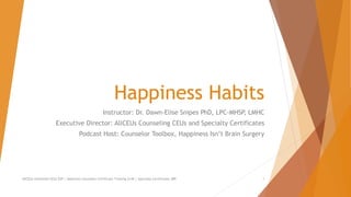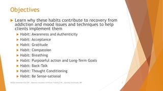 This document outlines habits that can promote happiness, including awareness and authenticity, acceptance, gratitude, compassion, deep breathing, purposeful action, challenging negative thoughts, and managing one's environment. The instructor discusses each habit in 1-2 pages and provides activities clients can do to implement the habits. The overall goal is for clients to adopt habits that contribute to recovery from addiction and mood issues.