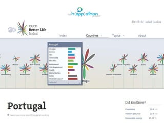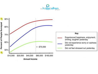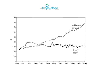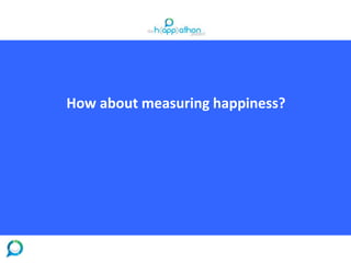 This document discusses different approaches to measuring happiness and well-being across countries and organizations. It describes Gross National Happiness, which uses surveys to measure quality of life in Bhutan. The OECD Better Life Index assigns importance to 11 categories that are essential to well-being, such as health, education, and work-life balance. The UK also officially monitors happiness by surveying citizens on their life satisfaction, happiness, anxiety levels, and the worthwhileness of their lives. The overall goal of these measures is to systematically track subjective well-being and inform policy decisions.