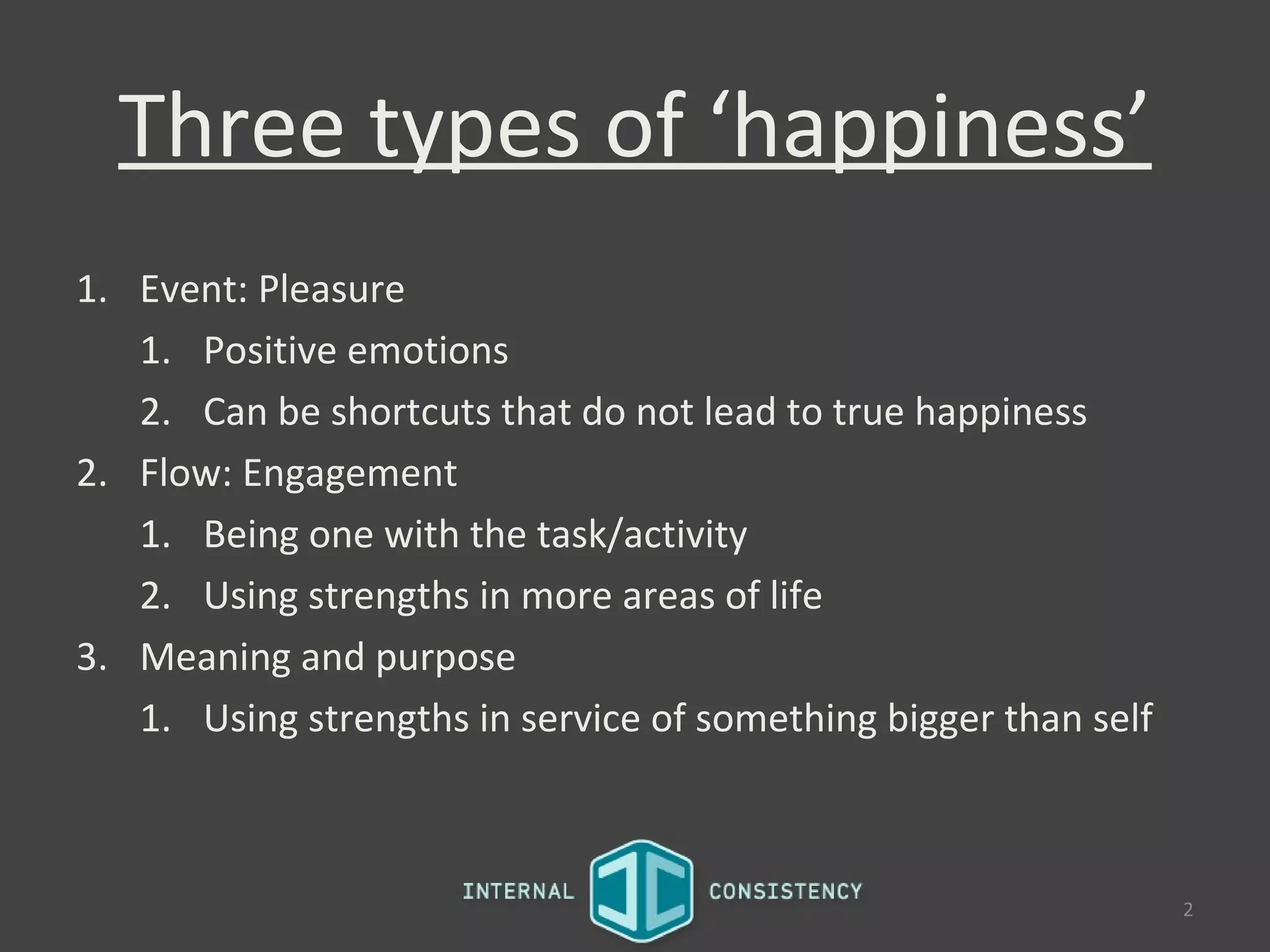 The document explores three types of happiness: pleasure, flow, and meaning and purpose. It highlights that pleasure is fleeting, flow occurs during peak engagement, and meaning comes from applying one's strengths towards a greater cause. True happiness stems from understanding and utilizing one's strengths in service to something larger than oneself.