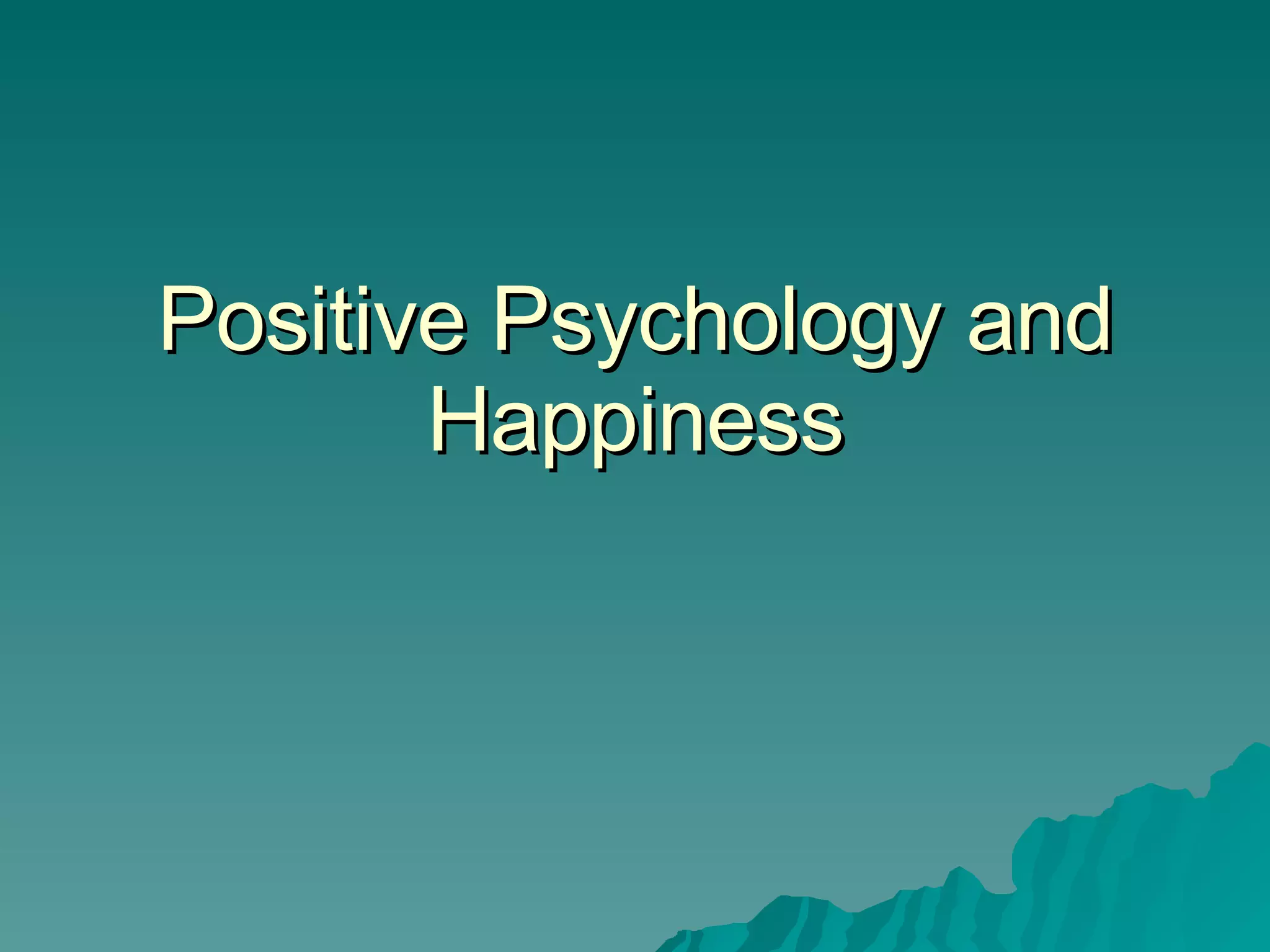 The document discusses positive psychology and factors related to happiness. It notes that rates of issues like divorce, teen suicide, crime, and depression have increased significantly from 1960 to 2000. Research shows that happiness is associated with benefits like better health, relationships, job performance, and longevity. Studies found that optimistic older adults had half the heart attack rates of less optimistic peers. The document advocates cultivating optimism, gratitude, and kindness to increase happiness and resilience.