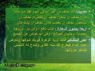 تتناول الوثيقة نصائح لتحقيق السعادة والرضا في الحياة، وتعزيز الثقة بالنفس والتوكل على الله. تؤكد على أهمية العلاقات الاجتماعية، الانتماء، والتفاؤل، وتوضح أن الرعاية والتسامح تجاه الآخرين تساهم في تعزيز السعادة. كما تشجع على الدعاء والصلاة كوسيلة لتحقيق الطمأنينة والسلام الداخلي.