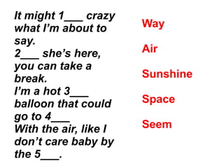 The song "Happy" by Pharrell Williams expresses feelings of happiness and joy. The singer claims that nothing can bring him down or dampen his upbeat mood because his level of happiness is too high. He encourages others to clap along and feel happy if it's what they want to do. Over two repetitions of the chorus, the singer maintains that no one can diminish his positive feelings of happiness.