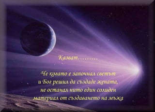 Казват………Че когато езапочнал светъти Бог решил да създаде жената,не останал нито един солиденматериал от създаването на мъжа - 3.