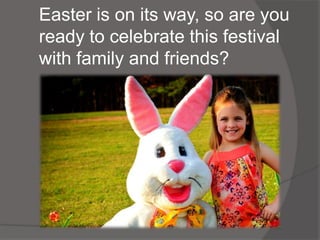 Easter is approaching and the document provides suggestions for celebrating with family and friends. Some traditions mentioned include coloring eggs, giving candy baskets to children, and attending the White House Easter egg roll or New York City Easter parade. The document also advertises a photo printing app called Snap2door that allows users to easily order prints from their photos and currently offers 4 free 5x7 prints.