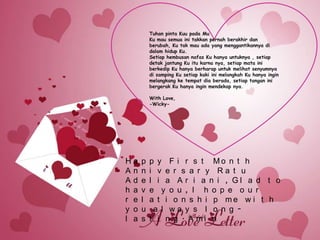 Dokumen ini menggambarkan perasaan cinta yang mendalam dan komitmen penulis terhadap seseorang yang sangat berarti dalam hidupnya. Penulis mengekspresikan harapan untuk selalu bersama dan mengingat masa lalu dengan penuh kasih. Cinta ini diibaratkan sebagai kekuatan yang membuat hidupnya terasa sempurna.