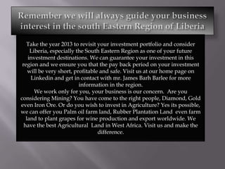 Liberia South Eastern Region Investment Brokers wishes prospective investors a successful business year in 2013 and encourages revisiting investment portfolios. They promote the southeastern region as a profitable and safe investment destination, particularly in mining and agriculture. Prospective investors are invited to contact them for more information and investment opportunities.