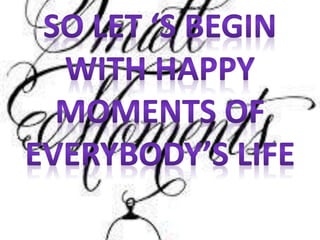This document discusses several happy moments in life, including completing one's education, getting a first job, receiving a first paycheck, making one's parents proud, experiencing first love, reaching a dream destination, getting married, having children, spending time with friends, and dancing in the rain. It emphasizes that happy moments, both big and small, are what make life worthwhile.