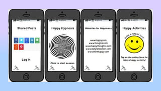 The document describes a proposed "Happy Thoughts" app aimed at helping teens with mental health issues like depression. The app would encourage sharing happy thoughts and reflections daily through suggested activities. It would also link to social media platforms to further facilitate sharing. The team developing the app has personal experience with teen mental health issues and wants to provide a phone-based solution to promote positivity.
