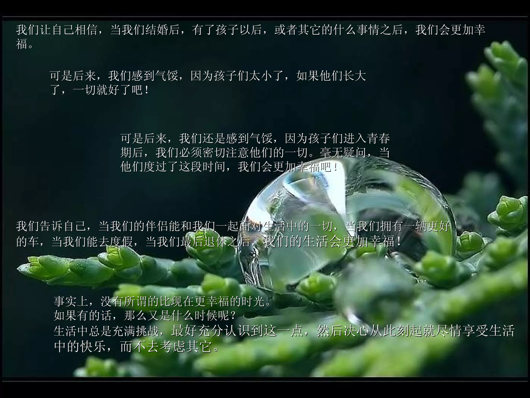 文档强调了幸福的真谛在于体验生活的每一刻,而非等待未来的某个时刻才能感到幸福。通过对比名人和对我们生活产生深远影响的人,传达了生活中真正重要的是彼此关心与支持。最终,生活不仅是个人的成功,更是帮助他人、一同前行的旅程。